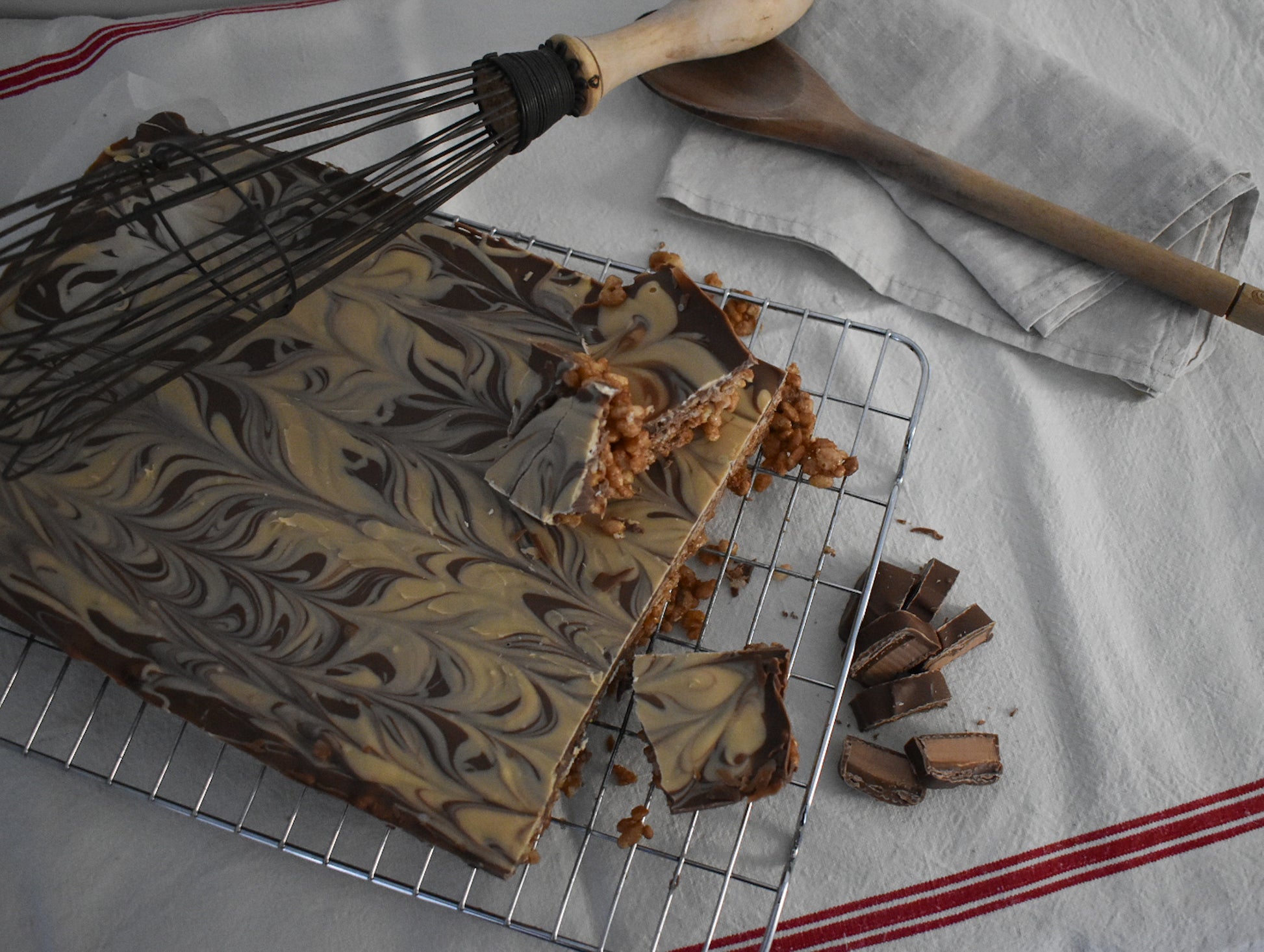 Contains: Butter, Mars Bars, golden syrup, rice krispies, milk chocolate, white chocolate